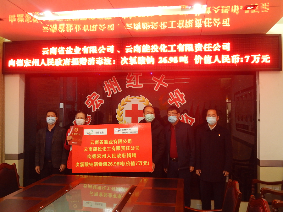 德宏公司代表鹽業(yè)公司、化(huà)÷¶λ工(gōng)公司向德宏州政府捐贈消毒液