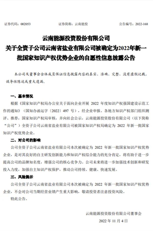 雲南(nán)鹽業(yè)首次通(tōng)過國(guó)家(jiⱕ)知(zhī)識産權優勢企業(yè)認定